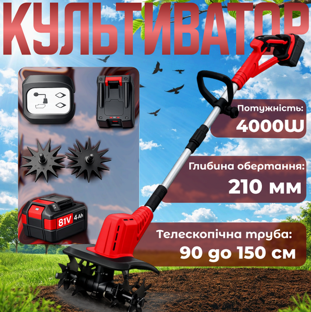 Акумуляторний ручний культиватор 48V для городу, теплиць та клумб, 2 АКБ, червоний