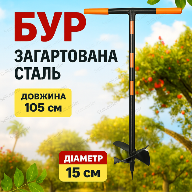 Земляний бур 15 см для саджанців стовпів шнек ручний 105 см інструмент садовий боровмісна сталь міцний