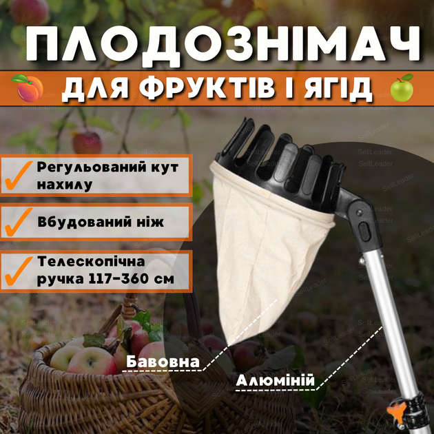 Плодозбирач телескопічний садовий Bradas держак 1.17-3.6м з мішком збирання зняття фруктів ягід яблук з дерева