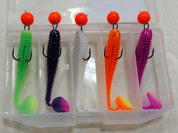 Повний комплект силіконових приманок для лову трофейної щуки з джиг-головками в коробці