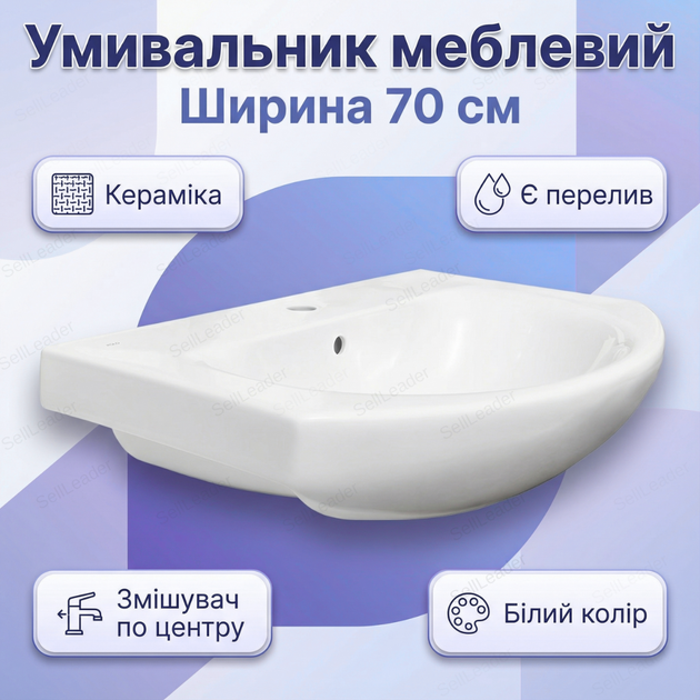 Умивальник Kolo Runa 70х48х19см накладний меблевий для ванної раковина на тумбу перелив 1 по центру білий
