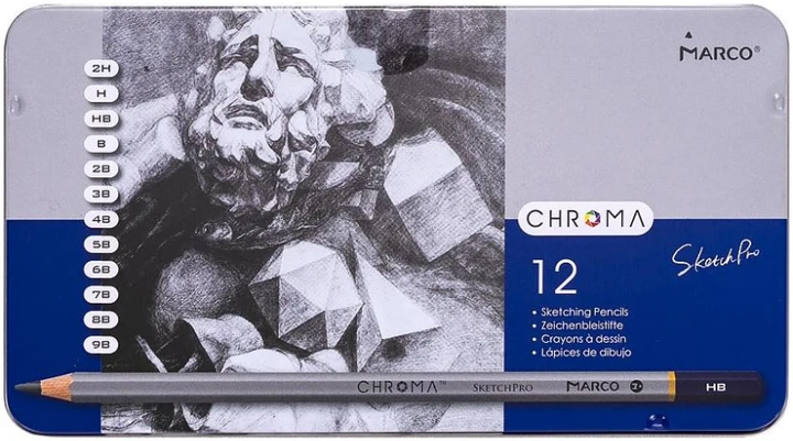 Набір графітних олівців різної твердості в металевому пеналі 2Н - 9B , 12шт. 8015-12TN Chroma MARCO