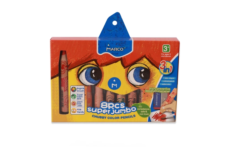 Кольорові олівці Marco 1800/3 в 1, 8 кольорів Super Jumbo, набір із точилом - творчість, малювання, хобі, подарунок, антистр