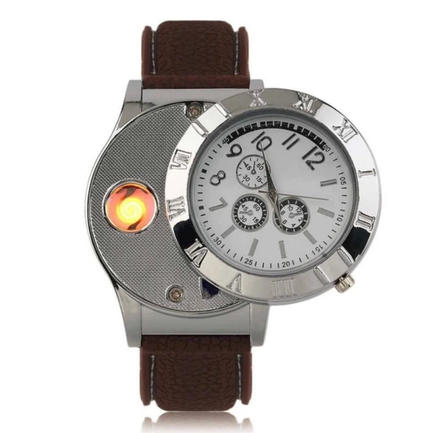 Годинник чоловічий наручний з вбудованою запальничкою USB, коричневий ремінець