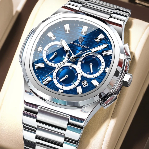 Чоловічий Наручний Годинник Poedagar Riverwood Сріблястий Кварцовий, Індекси, Дата, Синій Циферблат, Стальний Браслет Poedag
