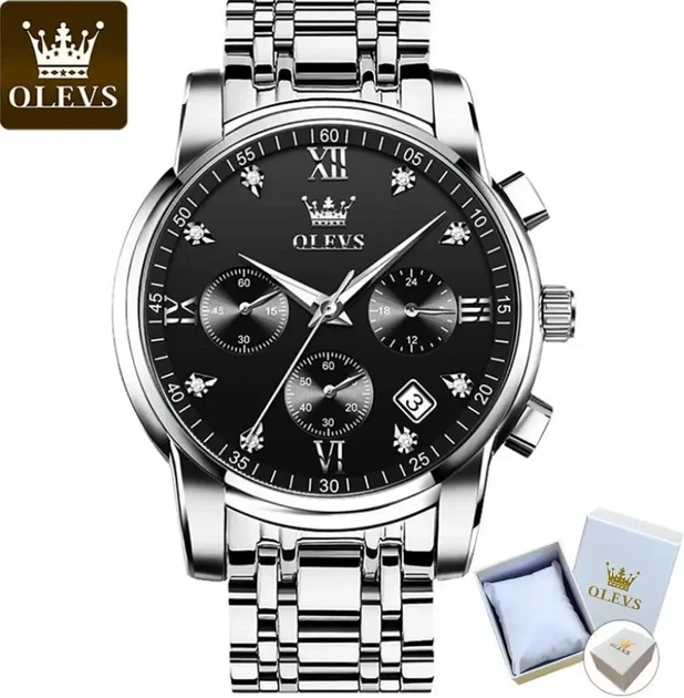 Чоловічий годинник Olevs 2858 Black, класичний кварцовий хронограф, преміум дизайн, чорний браслет (ol2858b)