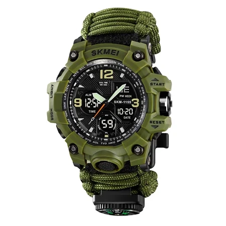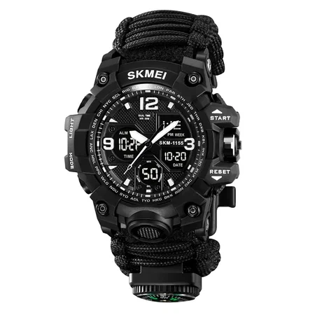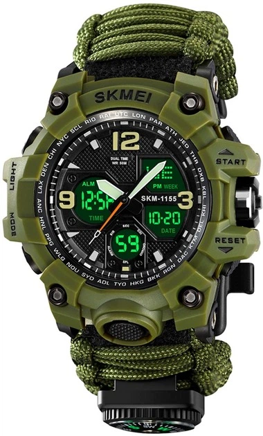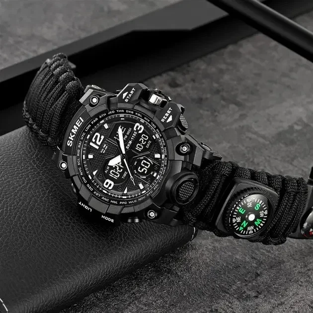 Годинник Skmei 1155BNBK Black з паракордовим ремінцем | Тактичний чоловічий годинник з компасом, термометром і LED дисплеєм