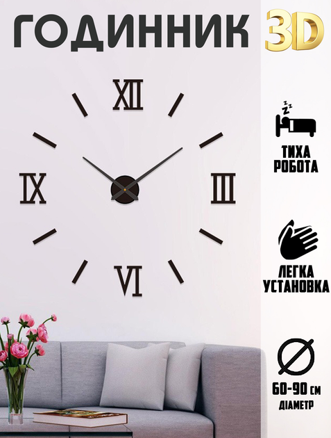 Настінний годинник 3D стрілочний CHY C030 безшумний 60-90см, з римськими цифрами та індексами