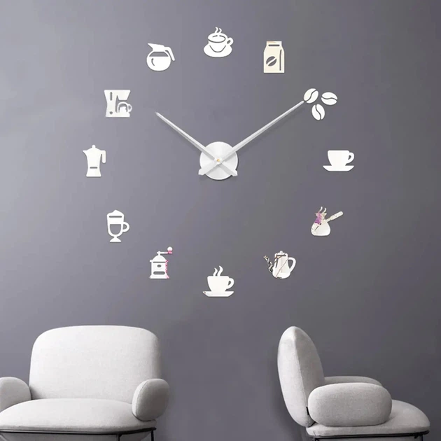 Настінний годинник DIY 3D "Espressoze" срібло - Великий безкаркасний 3Д годинник 60-130 см, самоклеячий (1011153)
