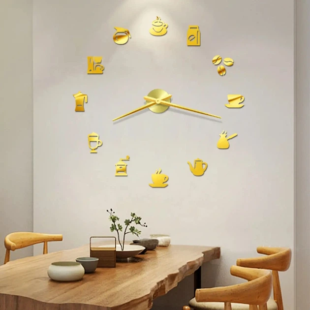 Настінний годинник DIY 3D "Espressoze" золотий - Великий безкаркасний 3Д годинник 60-130 см, самоклеячий (1011353)