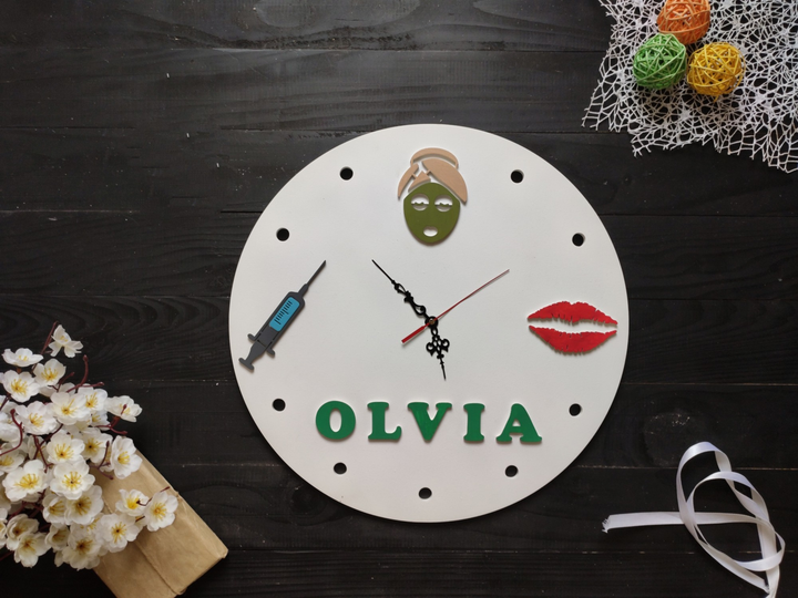 Настінний годинник з дерева для косметолога з назвою салону на замовлення (ЧС0060-3)