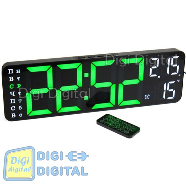 Настінний годинник - будильник SM-601 від USB, з термометром, з пультом чорний корпус зелені та білі цифри