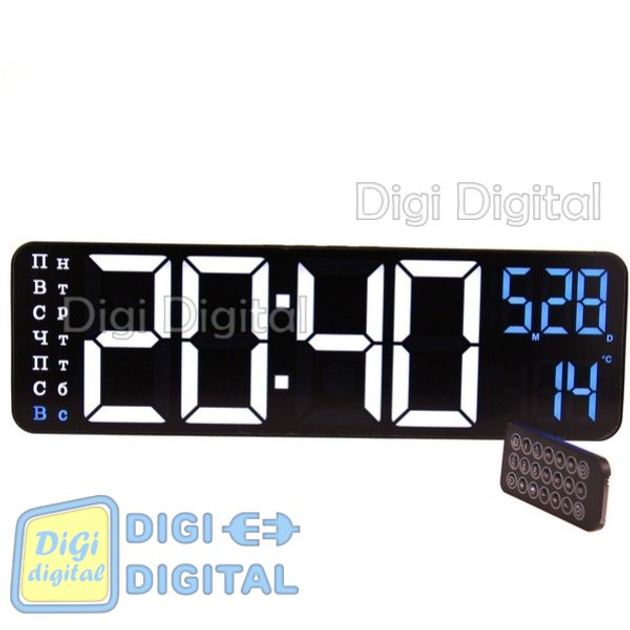Настінний годинник - будильник SM-601 від USB, з термометром, з пультом чорний корпус білі та блакитні цифри