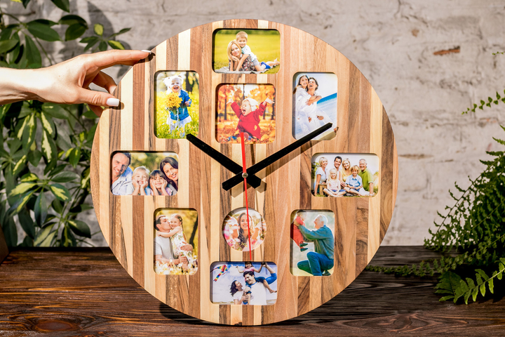 Настінний дерев'яний годинник круглий з фоторамками в середині EW-26