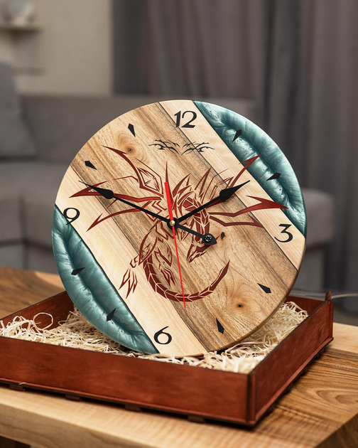 Настінний годинник ручної роботи Дракон, натуральне дерево та зелена смола, 34 см