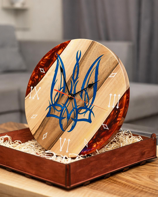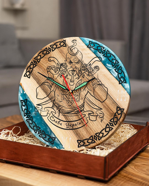 Настінний годинник з дерева та епоксидної смоли з козацьким гравіюванням «Слава Україні», 34 см