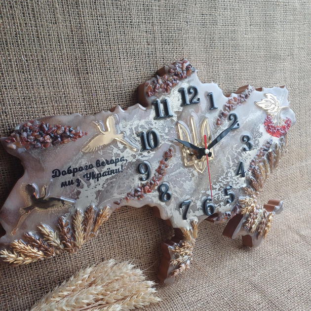 Годинник 60x38 см настінний з епоксидної смоли ручної роботи "Карта України" з колосками та гербом(ЧЕС00000091)