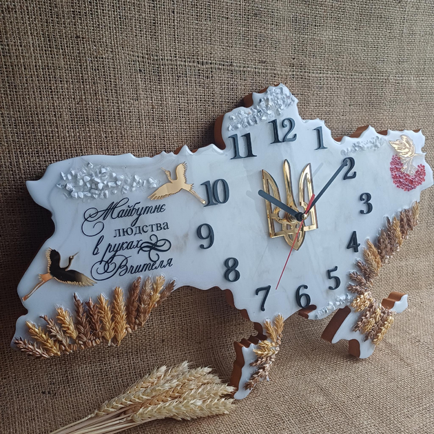 Годинник 70х45 см настінний з епоксидної смоли ручної роботи "Карта України" з колосками та гербом (ЧЕС00000078)