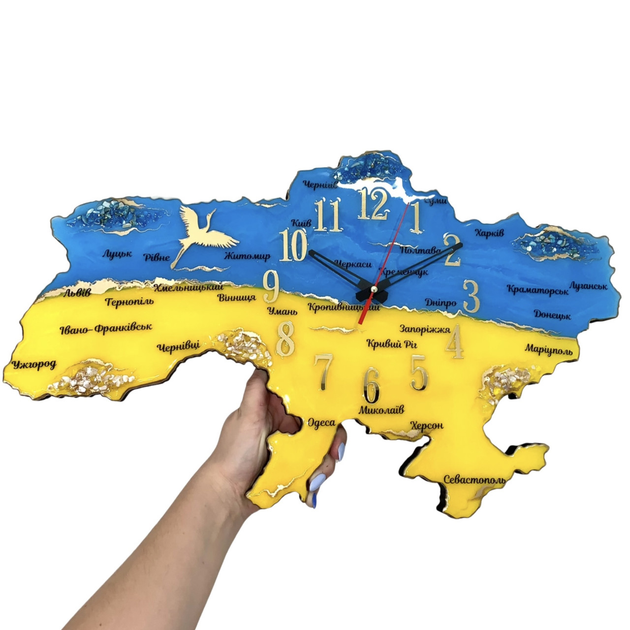 Годинник настінний з епоксидної смоли "Карта України" з містами 100х67 см (019-100)