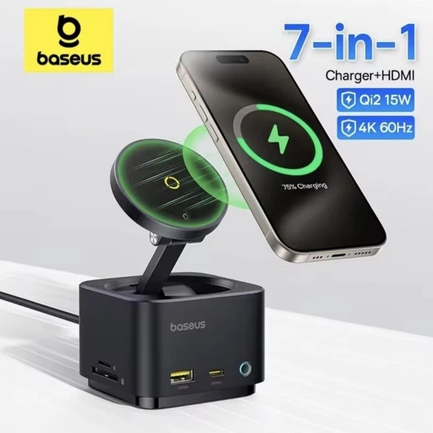 Магнітна бездротова зарядна станція Baseus MagPro Series II 7-в-1 Qi2 15W + USB-C Хаб 4K60Hz 10Gbps SD/TF Cosmic Black