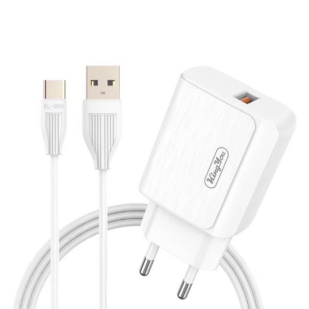 Зарядний пристрій для телефону USB 3А блок живлення для швидкого заряджання телефону + кабель 1м Type-C Kingyou KC86E White