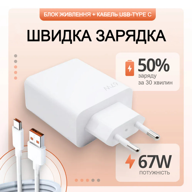 Зарядний пристрій для заряджання телефону 67W з USB кабелем Type-C, блок живлення, біле