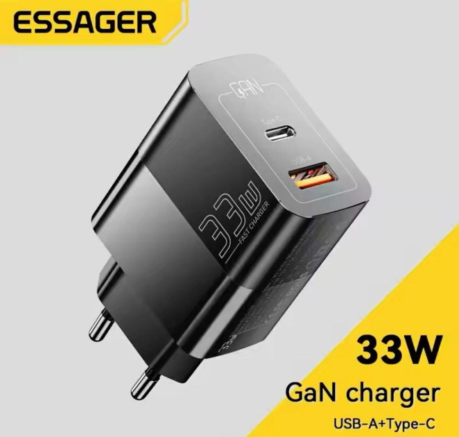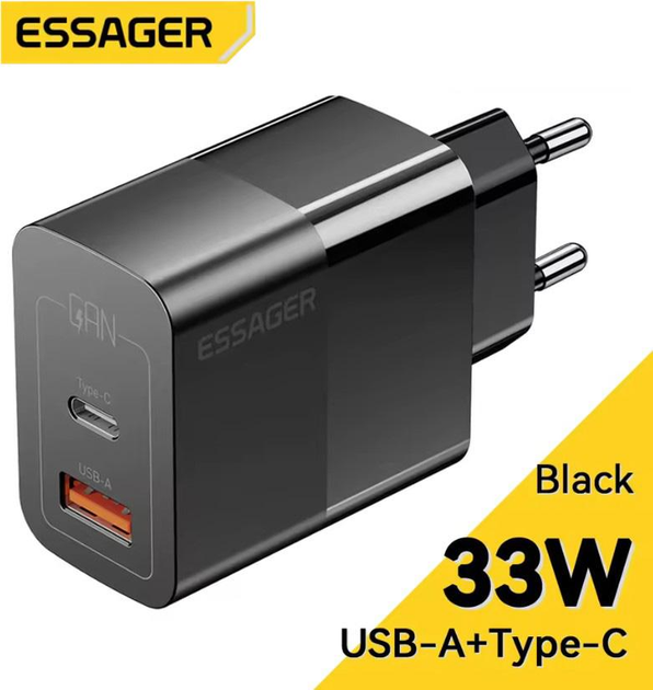 Зарядний пристрій Essager 33W GaN PD USB-C+USB-A Black