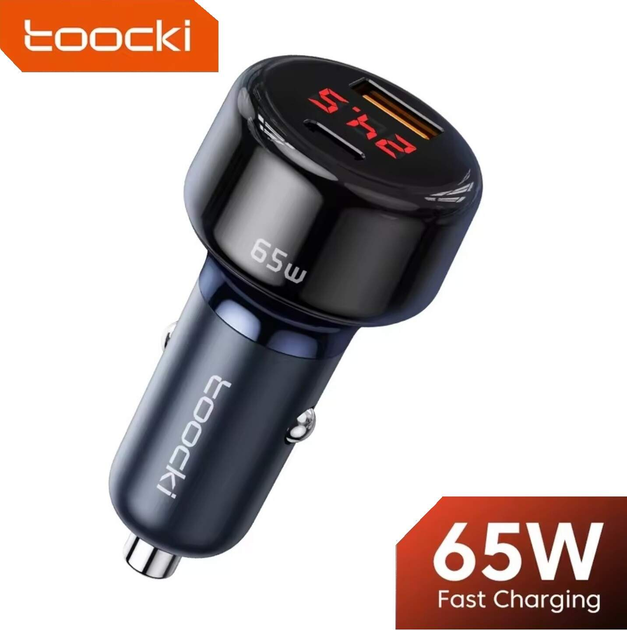 Автомобільний зарядний пристрій Toocki 65 W USB+TypeC з цифровим дисплеєм для ноутбуків, планшетів, смартфонів.