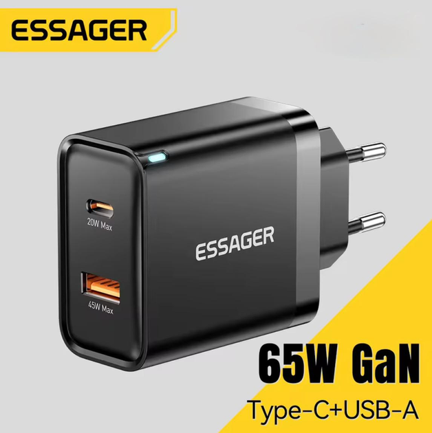 Мережевий зарядний пристрій Essager 65W GAN (Type-C + USB-A) ES-CD43 PPS, PD3.0/PD2.0, QC4.0/QC3.0/QC2.0, FCP, SCP, DCP