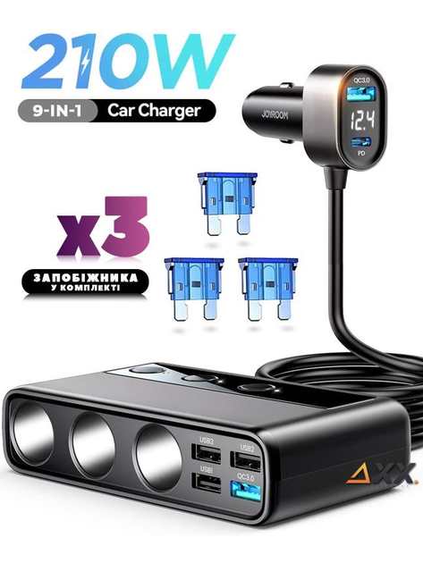 Розгалужувач прикурювача автомобіля 3 гніздаUSB-C PD36W + USB-A QC3.0 18W + 3USB-A з кабелем 1м з вимикачем на кожну розетку
