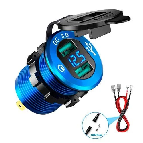 Адаптер в прикурювач 2xUSB QC3.0 з вольтметром, алюміній, синій
