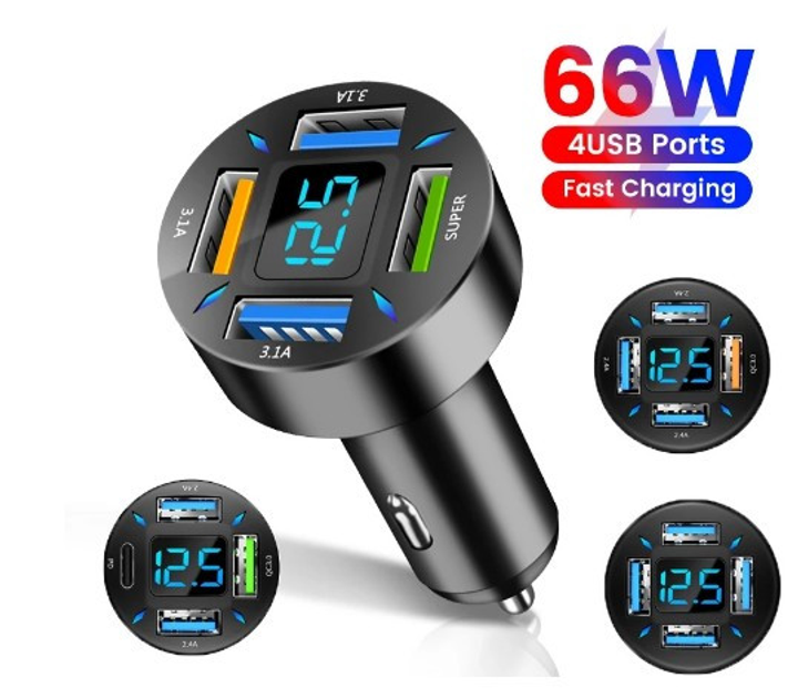 Авто зарядка USB OLAF 66W режим швидкого заряду QC 3.0 USB 4в1 тестер вольтометр