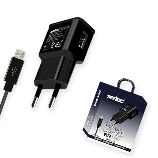Зарядний пристрій від мережі 220В на USB 2.1A , кабель - Micro USB, чорний Sertec