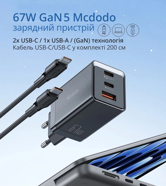 Мережевий зарядний пристрій Mcdodo 67W GaN 5/ два USB Type-C / USB-A + кабель USB-C/USB-C 200 см для телефона, ноутбука, Mac
