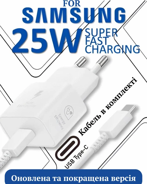 Швидка зарядка 25w для Samsung Galaxy з кабелем 1метр Super Fast Charging PD type-C Power Adapter, зарядний пристрій White