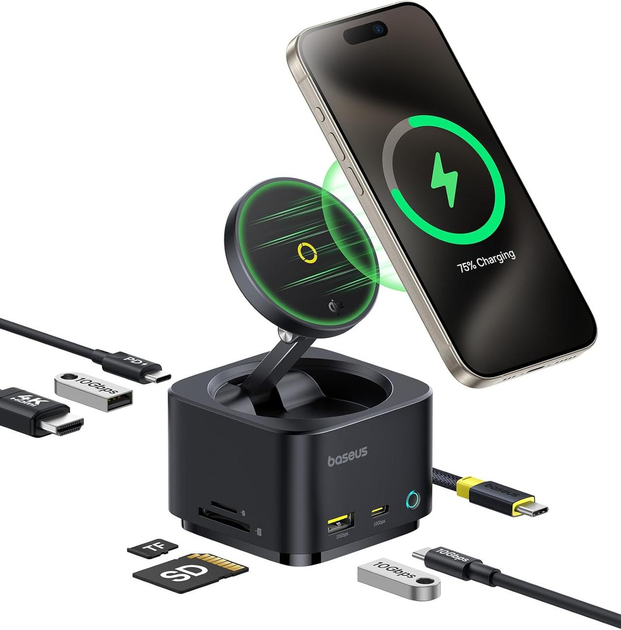 Бездротовий зарядний пристрій Baseus MagPro Series II 7-in-1 USB-C Hub with 15W Qi2 Wireless Charger