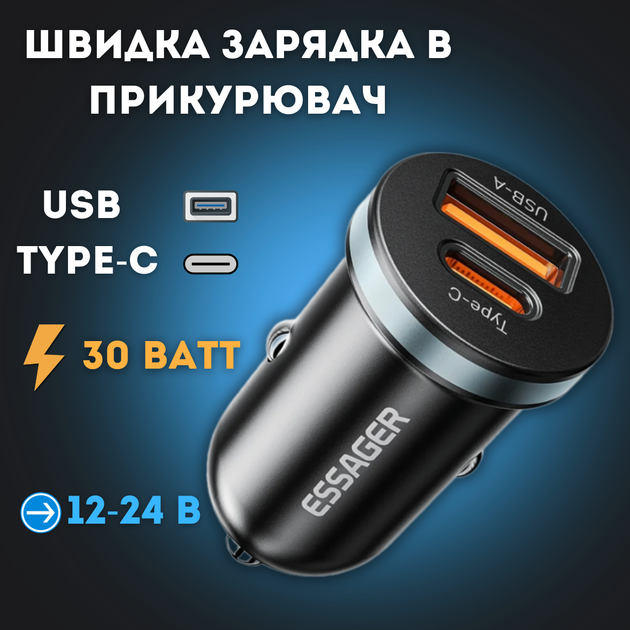 Зарядка в прикурювач ESSAGER USB type-C 30 Watt швидка зарядка QC4.0