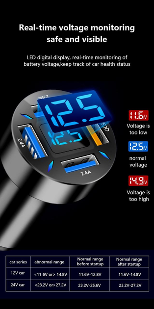 Автомобільна швидка зарядка USB QC 3.0 з вольтметром (DS9602)