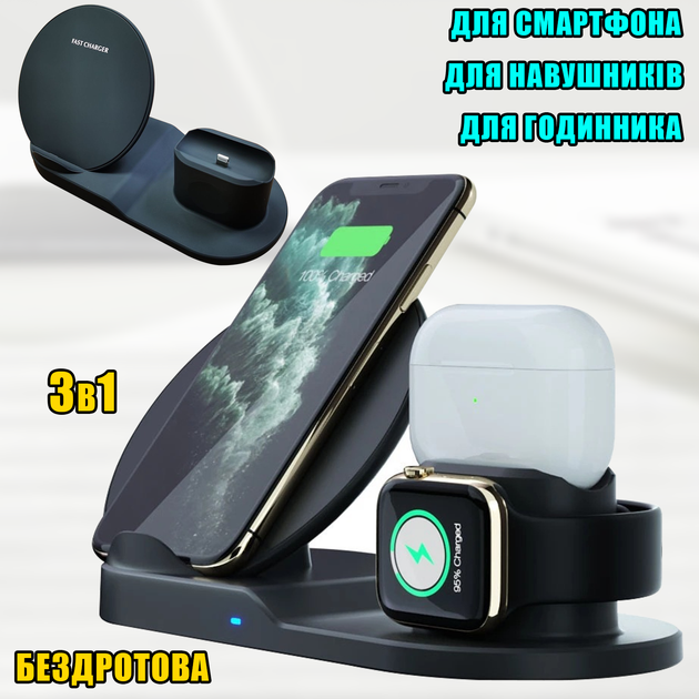 Бездротовий зарядний пристрій 3в1 док станція заряджання 7.5-10W Wireless Fast charger micro USB, Type-C, USB, Qi, Lightning