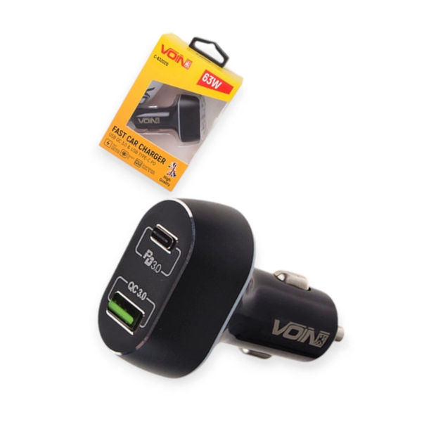 Зарядний пристрій від прикур. Voin 1USB , 1 USB Type-C PD 3.0А QC (63W), чорний Євро