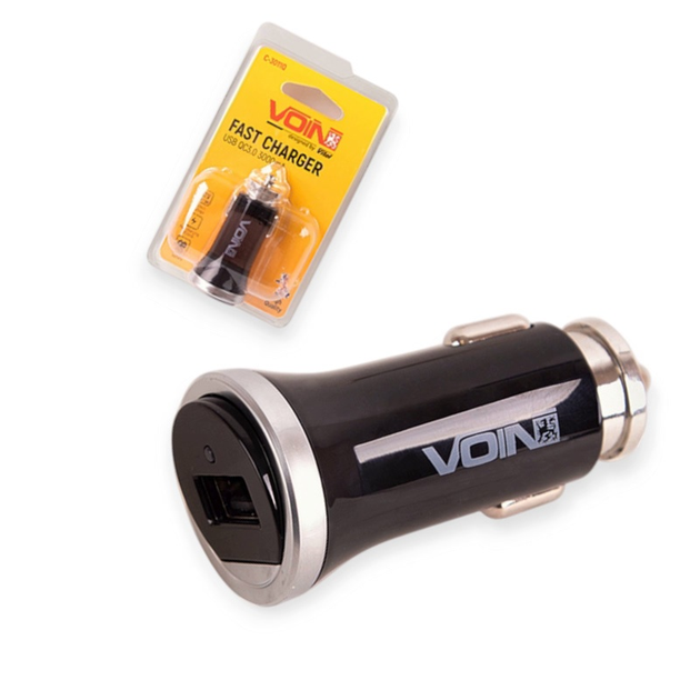 Зарядний пристрій від прикур. Voin 1USB 3.0А, 5В, 2.0А, 9В, 1.5А, 12В QC (три режими), чорний Євро