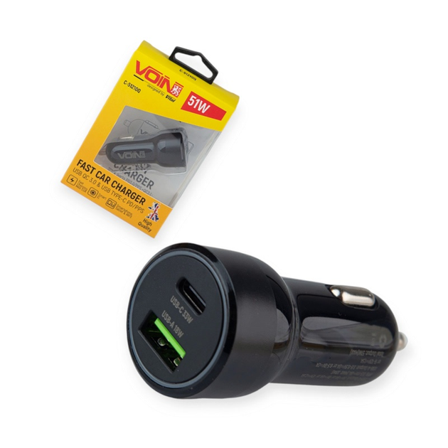 Зарядний пристрій від прикур. Voin 1USB , 1 USB Type-C PD 3.0А QC (45W), чорний Євро