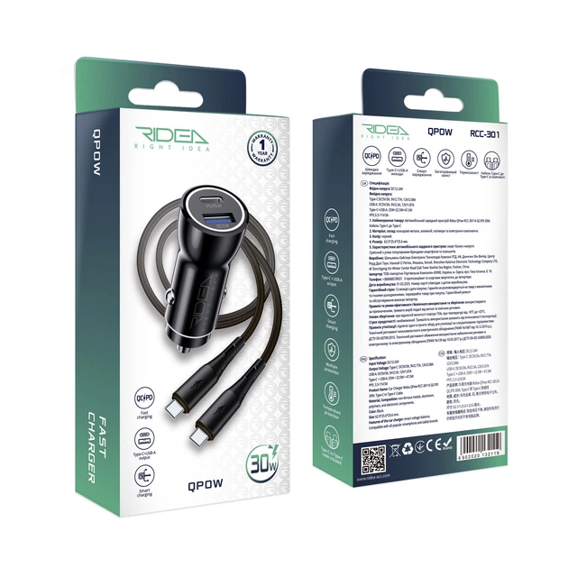 Автомобільний зарядний пристрій Ridea RCC-30115 QPow 1USB/1USB-C Fast charging support PD/QC 30W комплектується кабелем Type