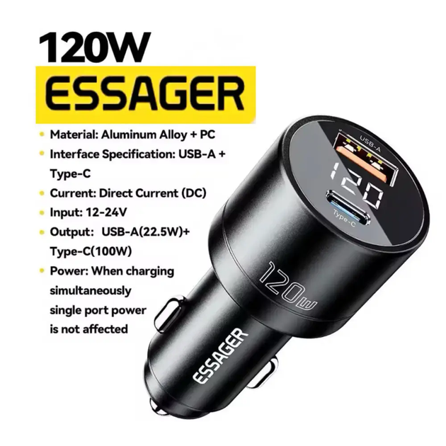 Автомобільний зарядний пристрій Essager 120W LED (Type-C 100w + USB 20w) Metall
