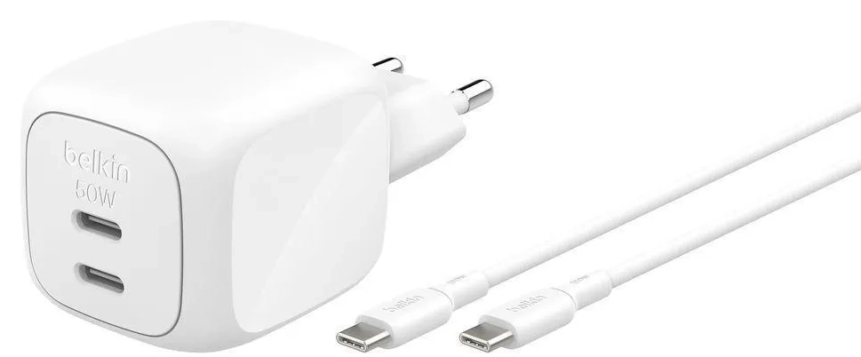 Ун. МЗП Belkin 50Вт 2хUSB-С GAN PD PPS, кабель USB-С - USB-C, 1м, білий