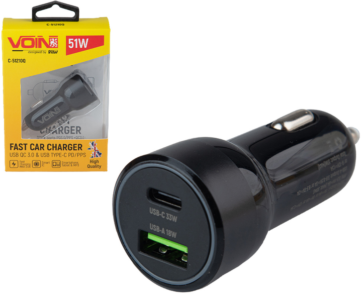 Автомобільний зарядний пристрій Voin 51W 1USB QC3.0 18W + 1PD 33W 12/24V (C-51210Q (100))