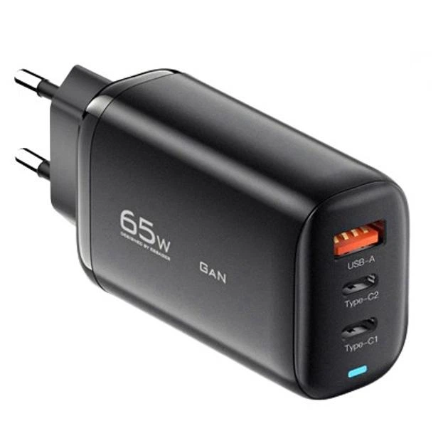 Зарядний пристрій Essager 65W GaN блок живлення з потрійним виходом (2 Type-C + 1 USB-A), чорний, для ноутбуків та гаджетів