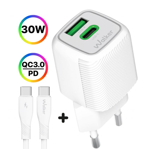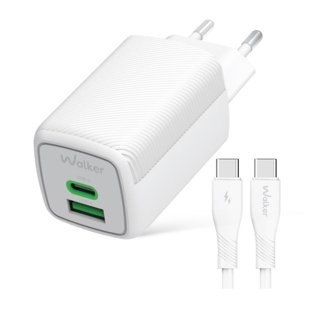 Мережевий зарядний пристрій (адаптер) 2в1 WALKER WH-71 GAN 30W + Data Cable Type-C to Type-C white