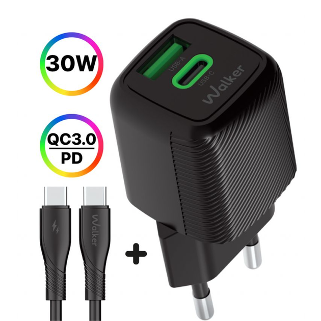 Мережевий зарядний пристрій (адаптер) 2в1 WALKER WH-71 GAN 30W + Data Cable Type-C to Type-C black