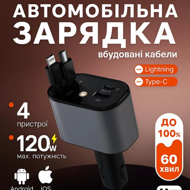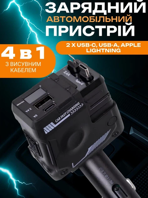 Автомобільна зарядка в прикурювач MECHA 66 Вт автомобільний зарядний пристрій для телефону 4 в 1 з висувним кабелем Type C/L